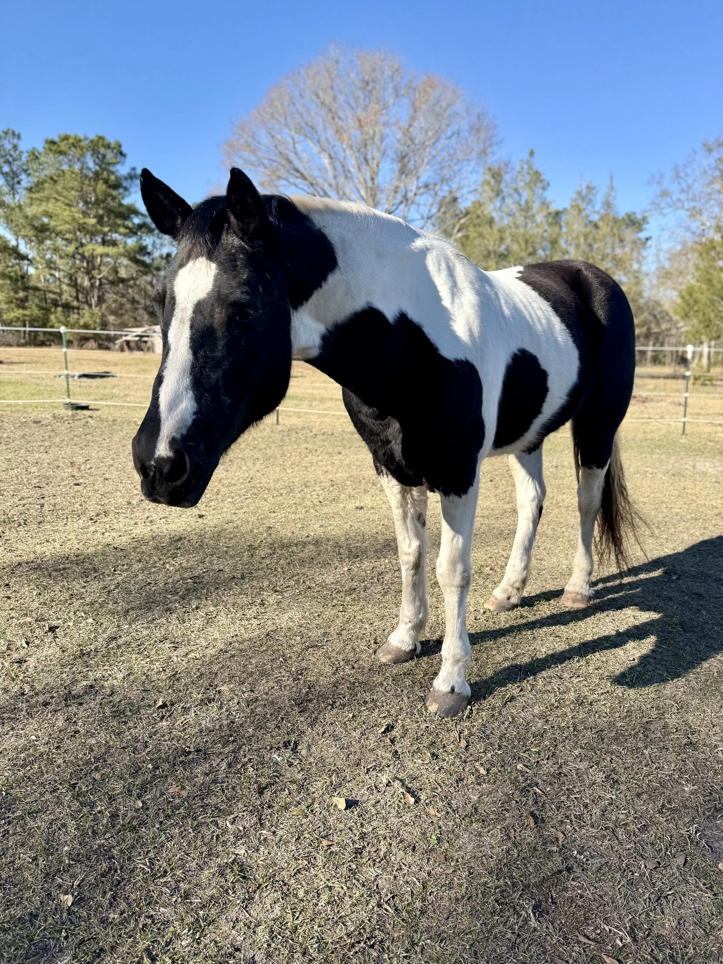 With her bold black-and-white markings and gentle eyes, Sierra often reminds us of the Chick-fil-A cow—but she’s all horse, and all heart. This sweet (and occasionally stubborn) draft cross came to Blue Sky Acres alongside her lifelong companion, Todd. Originally from Arizona, the two were part of a special program where their owner welcomed individuals with disabilities and those in need of extra care to experience healing through horses.
