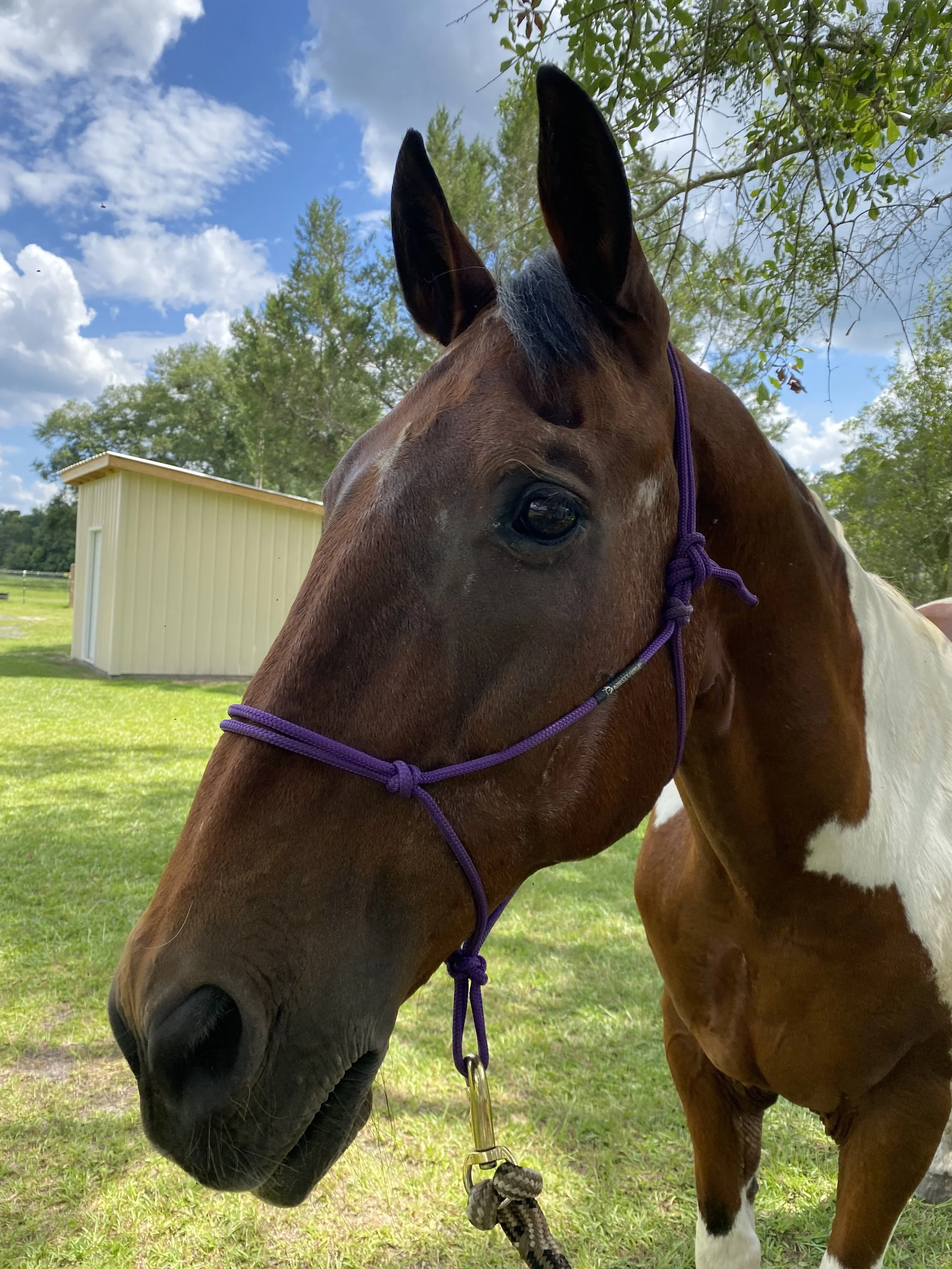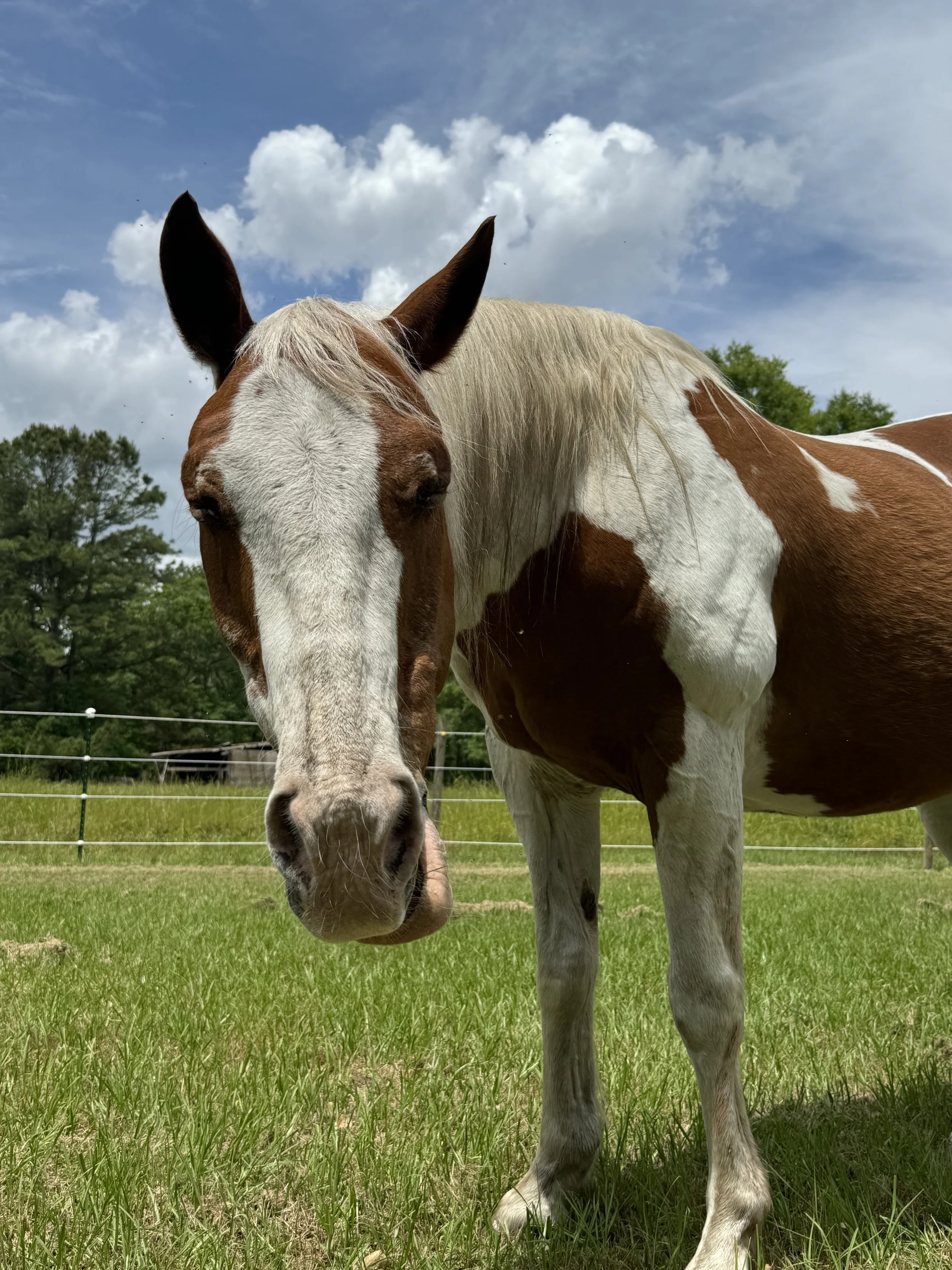 Banjo was one of the very first horses to call Blue Sky Acres home, and he’s been quietly holding down the fort ever since. Now in his 20s, Banjo may not be the most outgoing member of the herd—but for those who take the time to earn his trust, he’s a treasure.